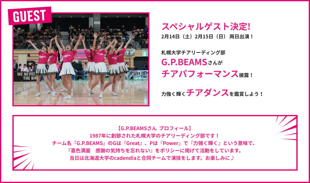 | 14:05 | 札幌大学チアリーディング部「G.P.BEAMS」チアパフォーマンス |